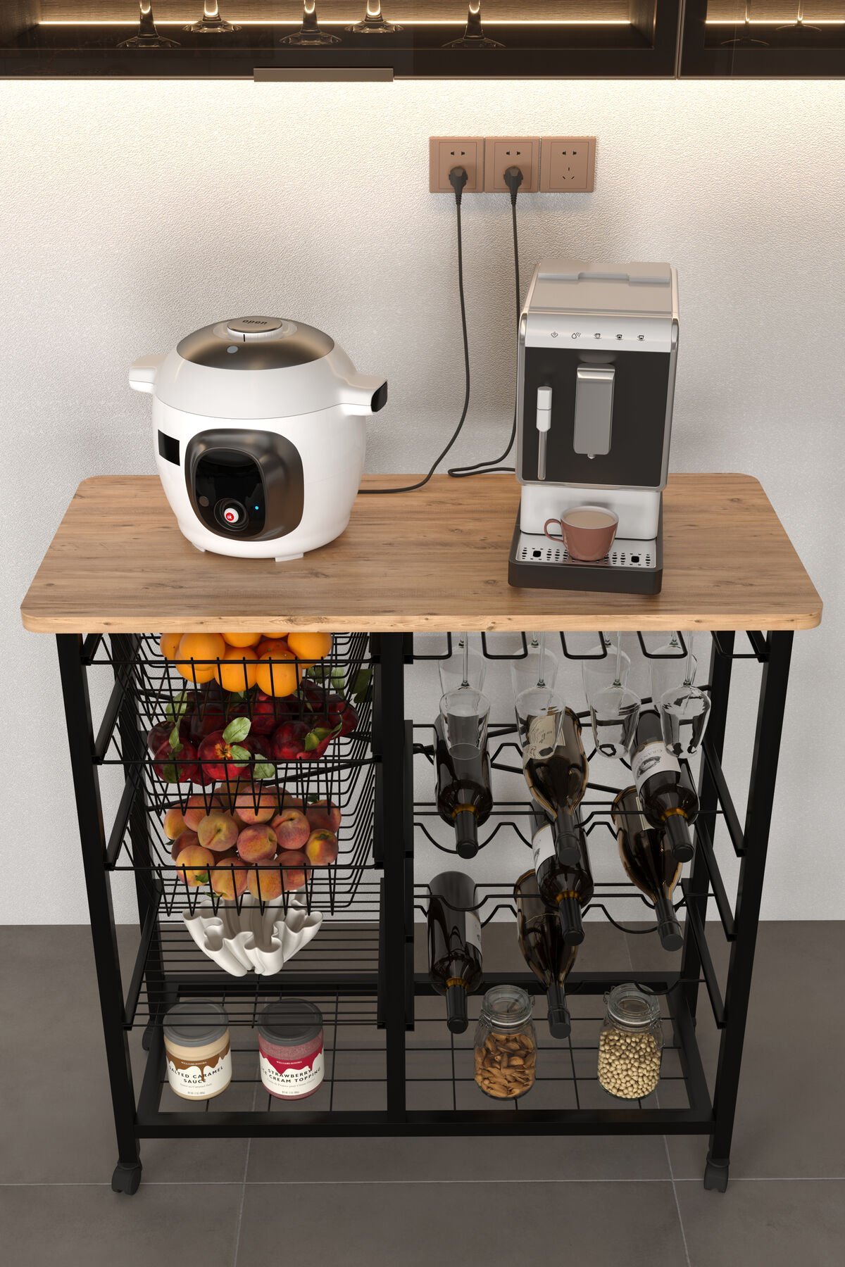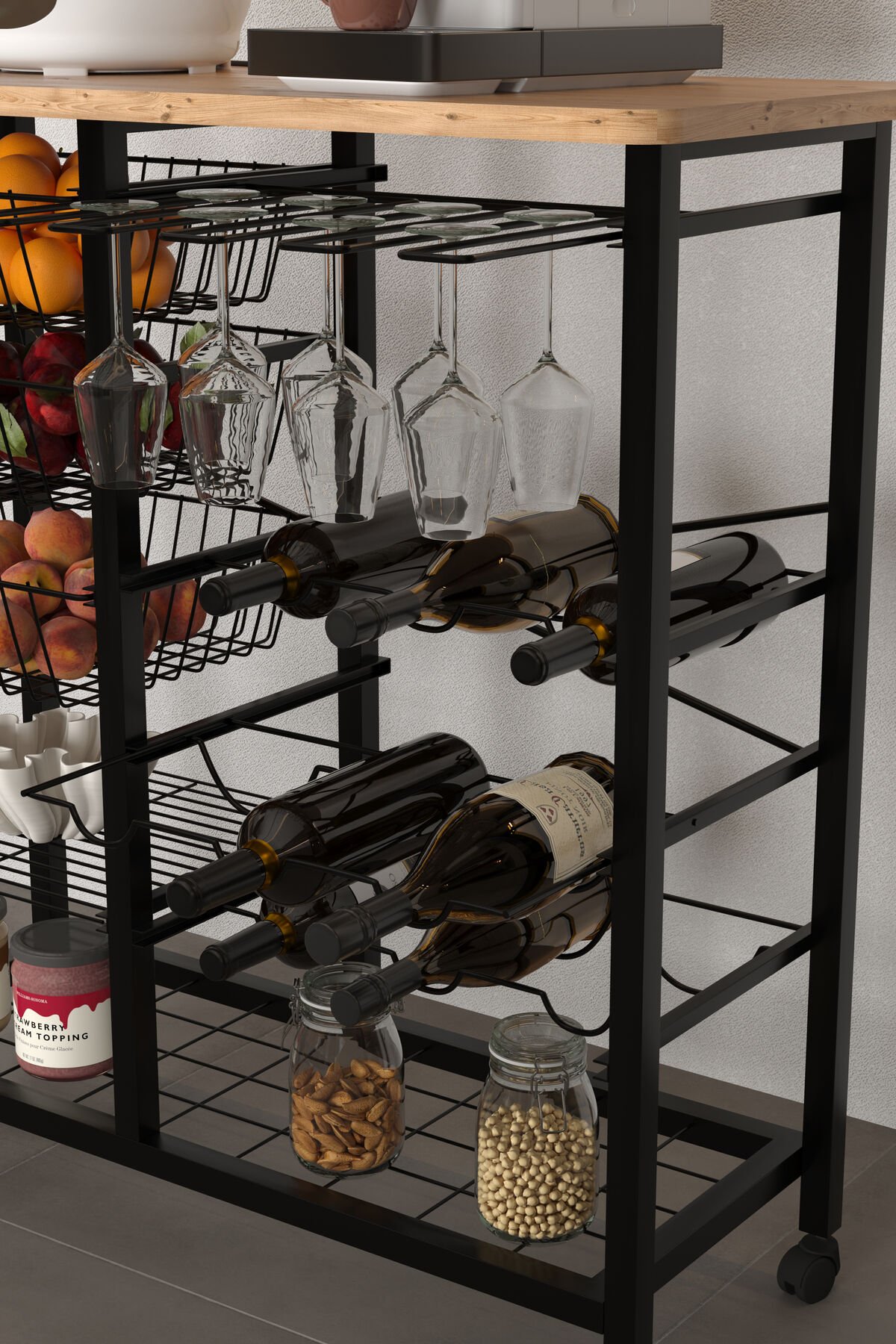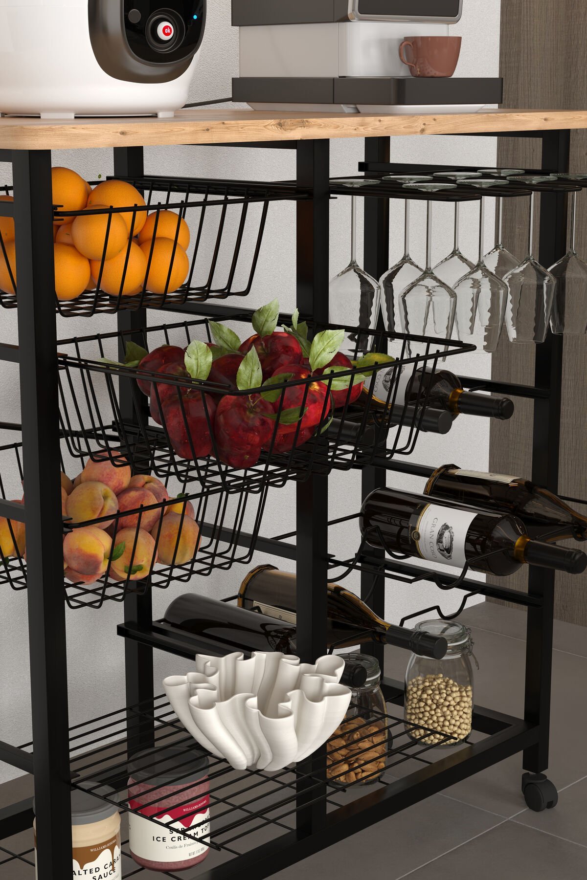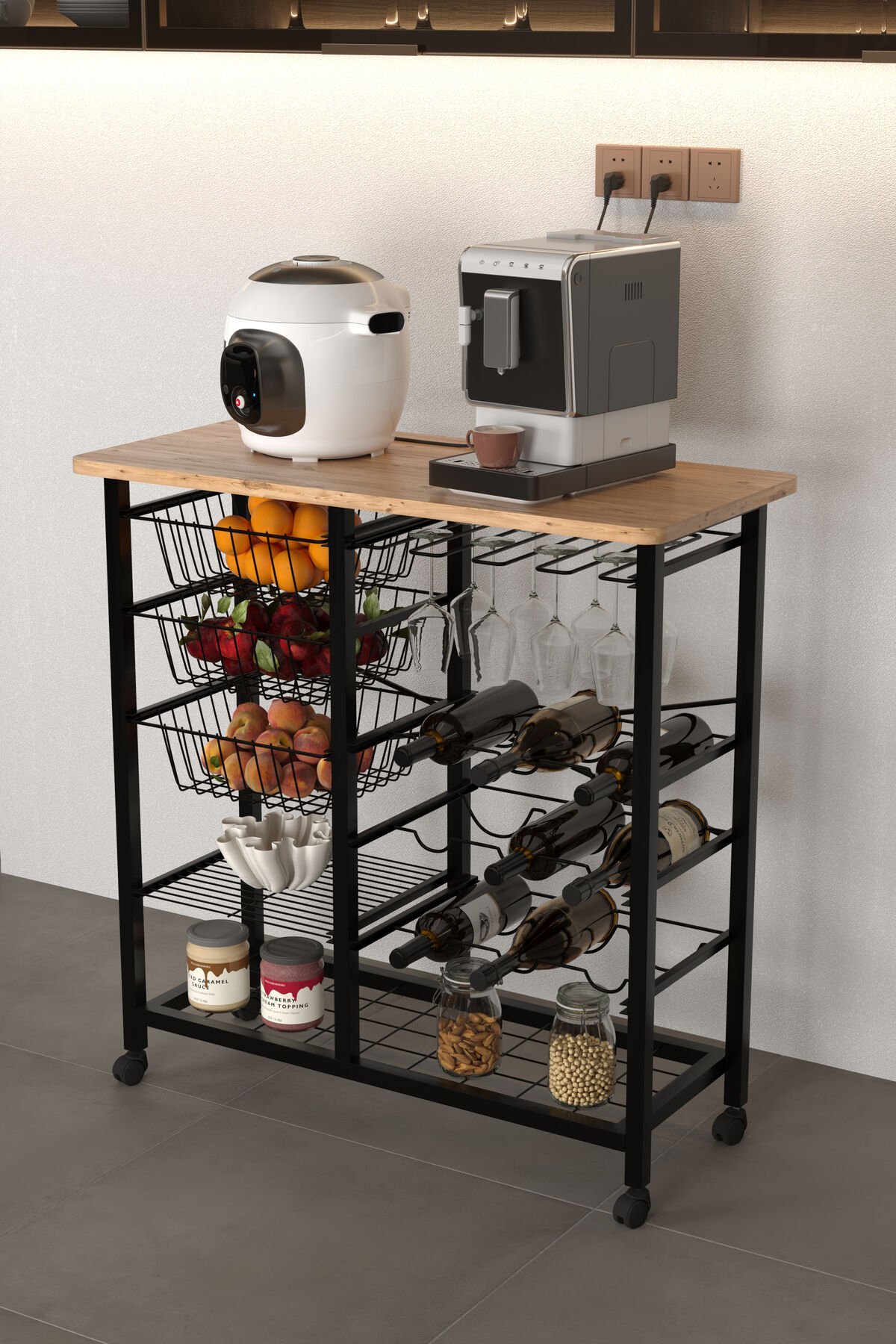 Bar Bango Masa Tekerlekli Sebzelik Metal Kahve Köşesi, Çok Amaçlı Mutfak Düzenleyici Sehpa
