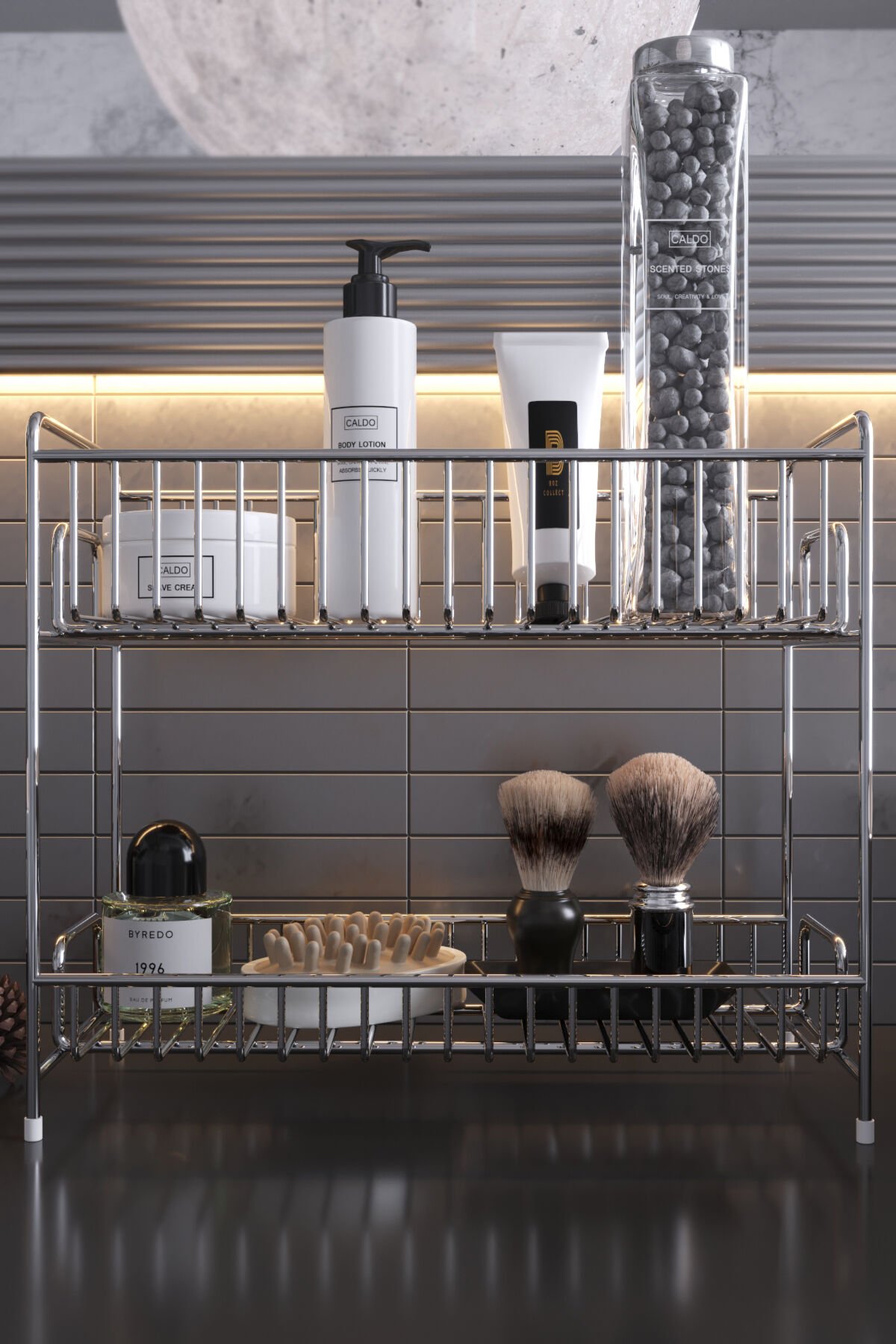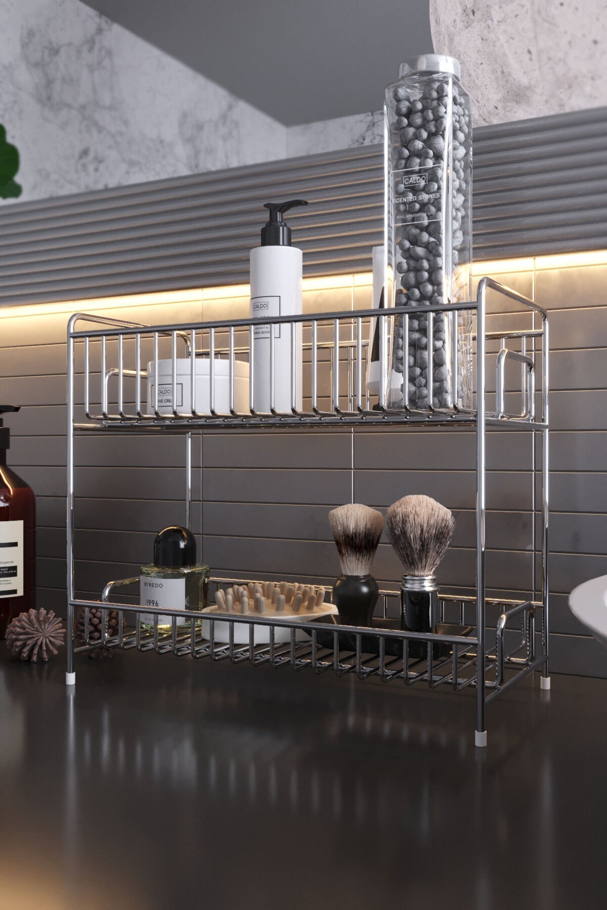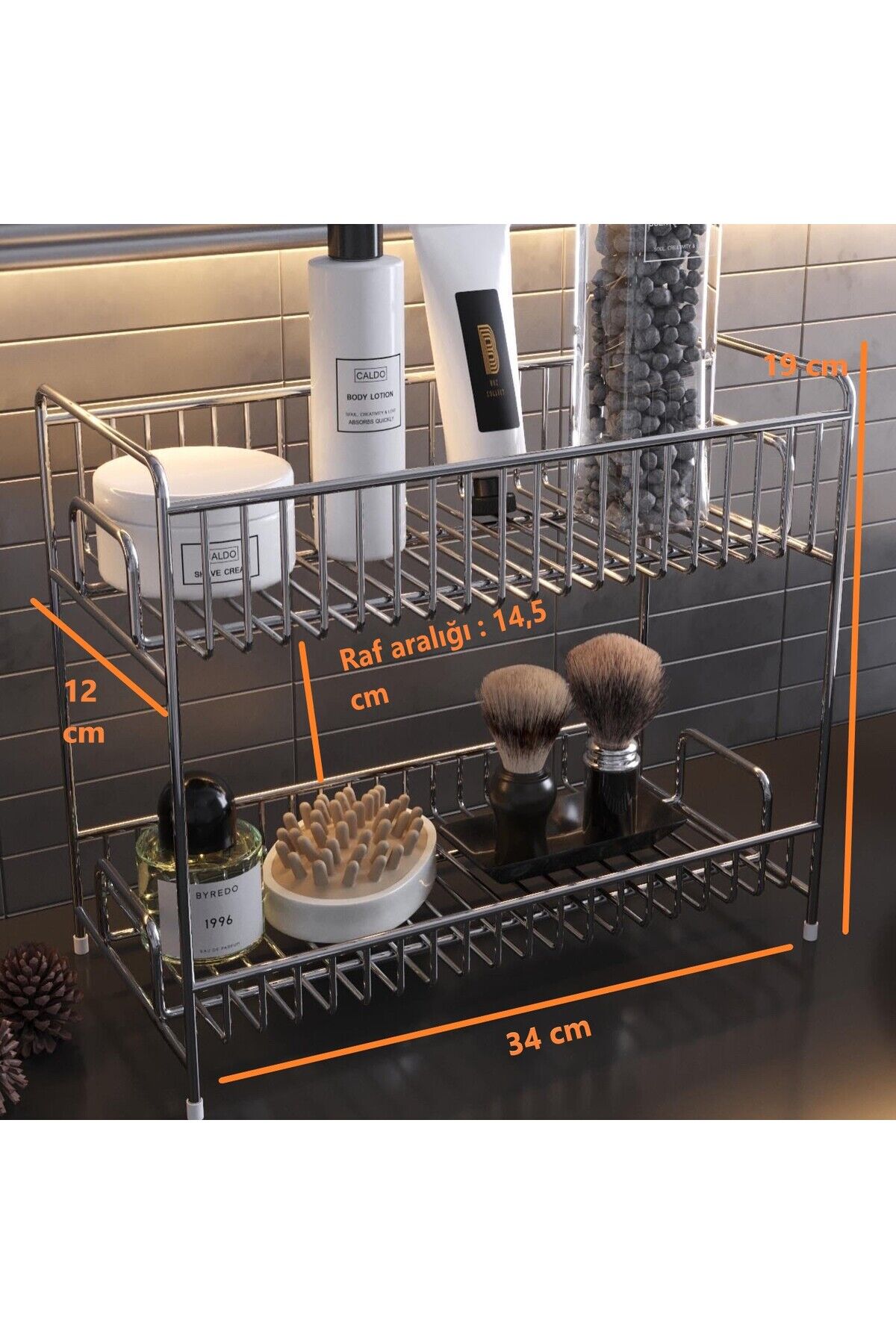 Dayanıklı metal malzeme kullanımı sayesinde uzun ömürlü ve sağlam bir yapı sunar; İki katlı tasarımı ile banyo ve mutfakta geniş depolama alanı sağlar, eşyalarınızı düzenli bir şekilde saklamanızı kolaylaştırır; Baharatlık olarak da kullanılabilme özelliği ile mutfakta da pratik bir düzenleyici olarak işlev görür;