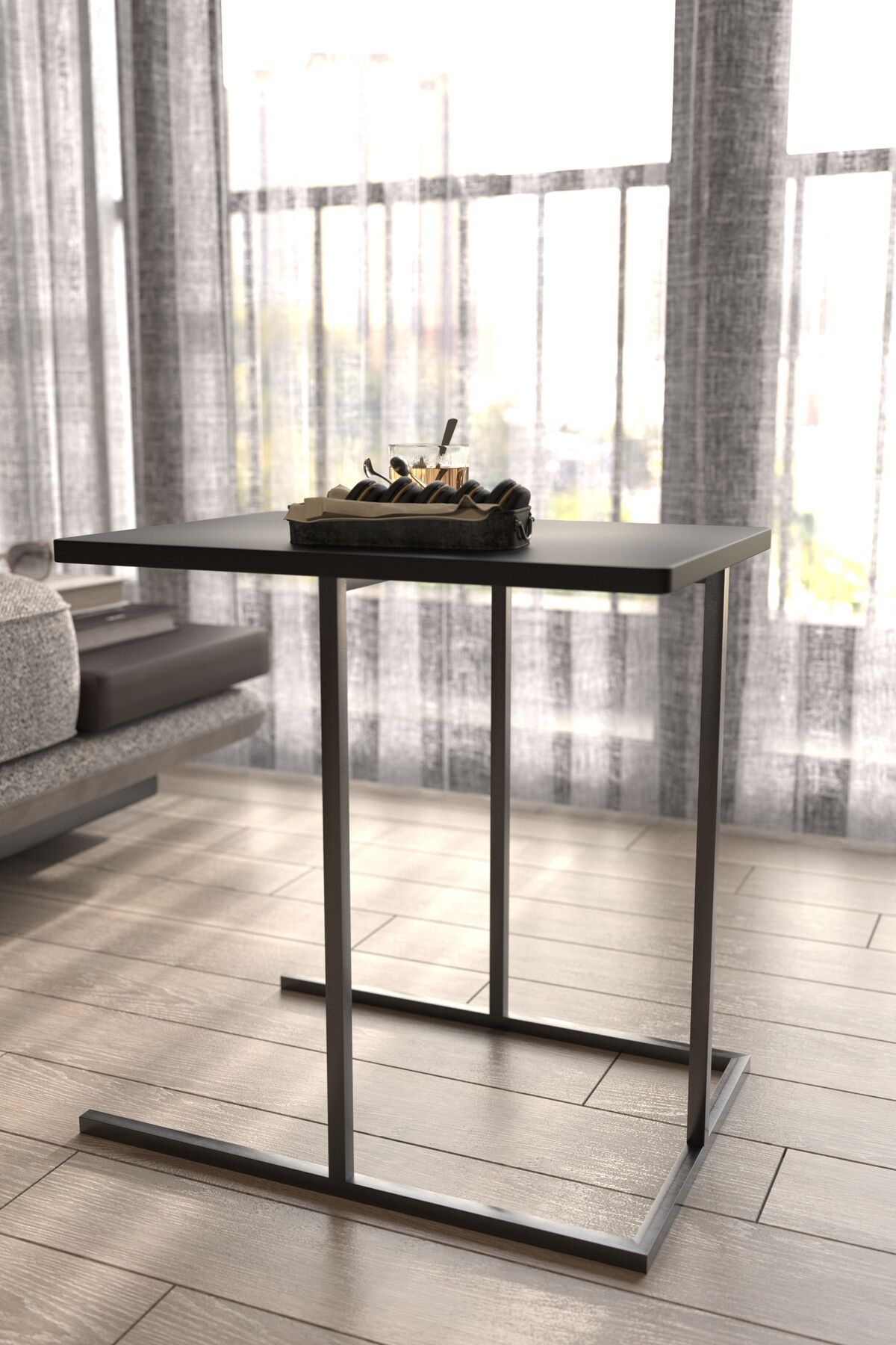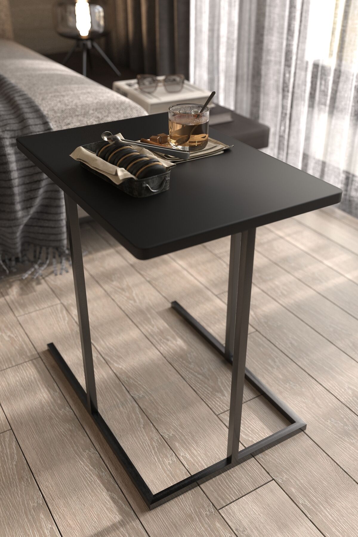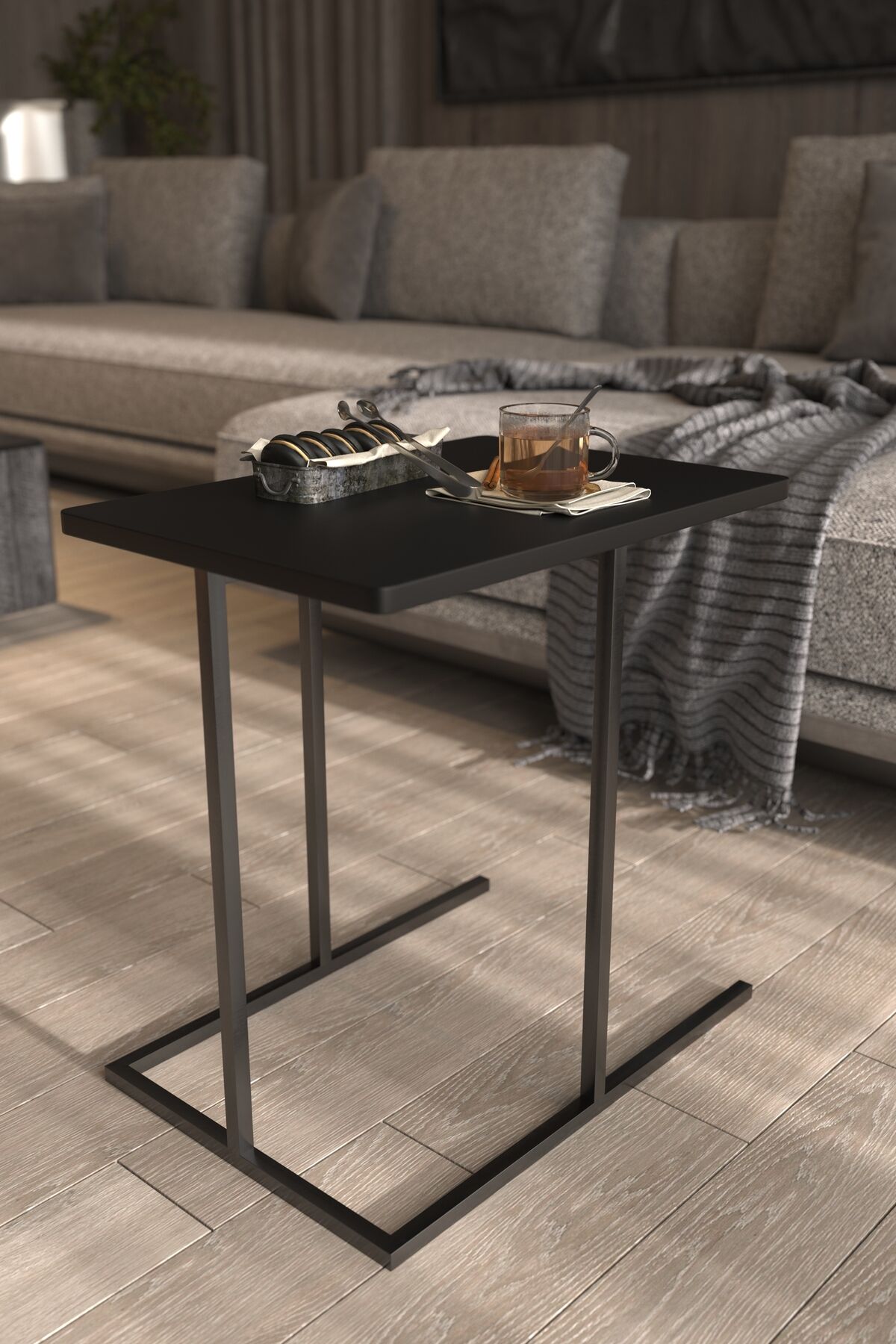 Yan Sehpa Dekoratif Metal Ayaklı Siyah Ahşap Tablalı Koltuk Yanı Çok Amaçlı Mutfak Düzenleyici